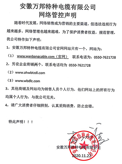 鄭重聲明:安徽萬邦特種電纜有限公司官方網站為:www_wanbangcable_com.hzbxb.cn,除此之外無任何子網站或合作網站,其余均為假冒偽劣。電話:0550-7621728 13485756353 地 址:安徽省天長市滁州高新技術產業開發區經四路29號